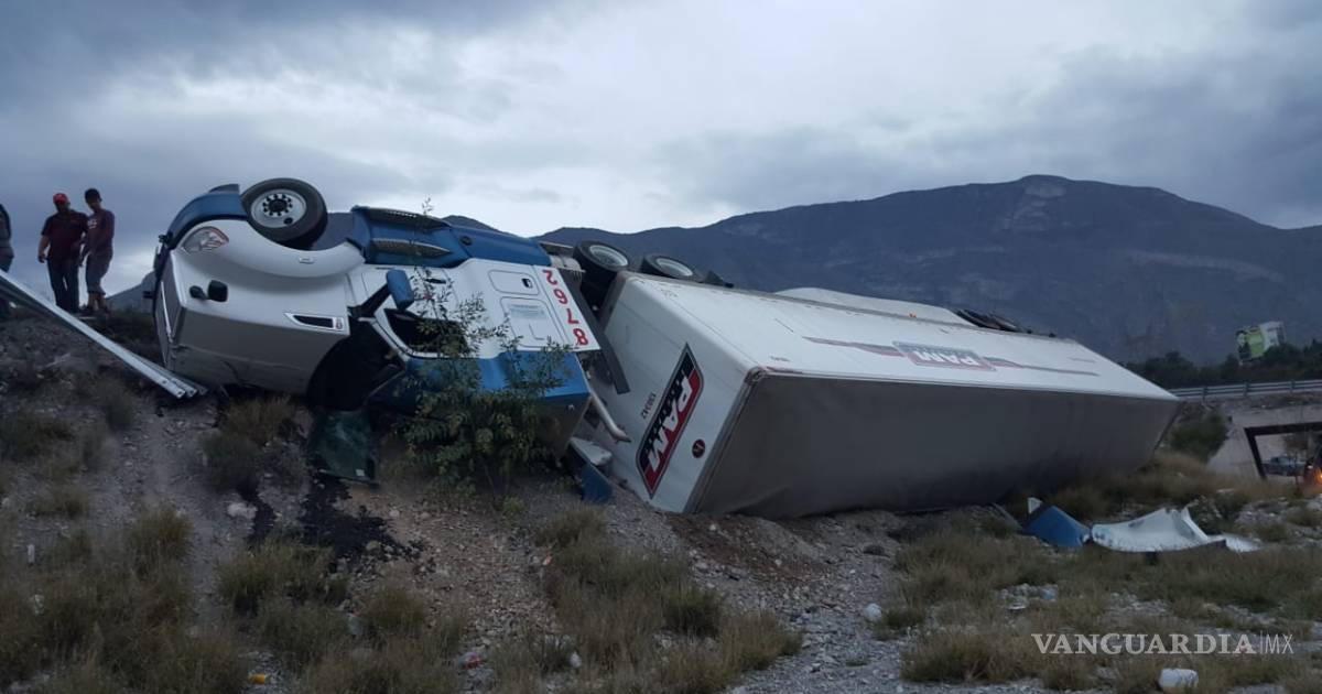 Volcado a un costado de la carretera terminó un tráiler a la altura del kilómetro 54 en la carretera Saltillo-Monterrey, el operador manifestó que las llantas salieron de la cinta asfáltica y no pudo regresar al camino.