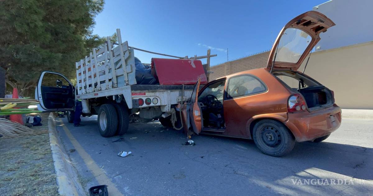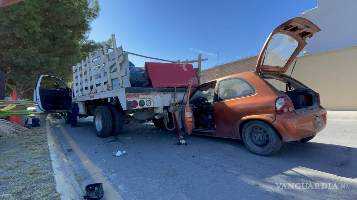 Se estrella contra camioneta y casi termina prensada en Saltillo; testigos sugieren que sol la cegó