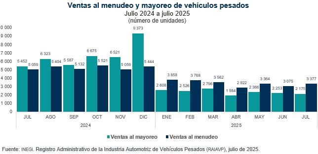 En julio de 2025, la venta de vehículos pesados en México registró fuertes retrocesos: al menudeo se colocaron 3 mil 377 unidades, una baja de 33.2 por ciento, y al mayoreo, 2 mil 175, con una caída de 60.1 por ciento. De acuerdo con el Registro Administrativo de la Industria Automotriz de Vehículos Pesados (RAIAVP), en ese mismo mes la producción sumó 9 mil 668 unidades, 55.1 por ciento menos que en igual periodo de 2024.