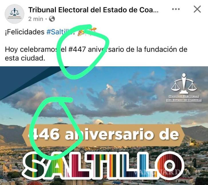 Si bien al escribir “Felicidades #Saltillo” y sumar dos emoticones festivos, para luego apuntar: “Hoy celebramos el #447 aniversario de esta ciudad” no cometió ningún error, fue en el encabezado pegado en la foto, con el logo del tribunal en una esquina, donde falló por un año.