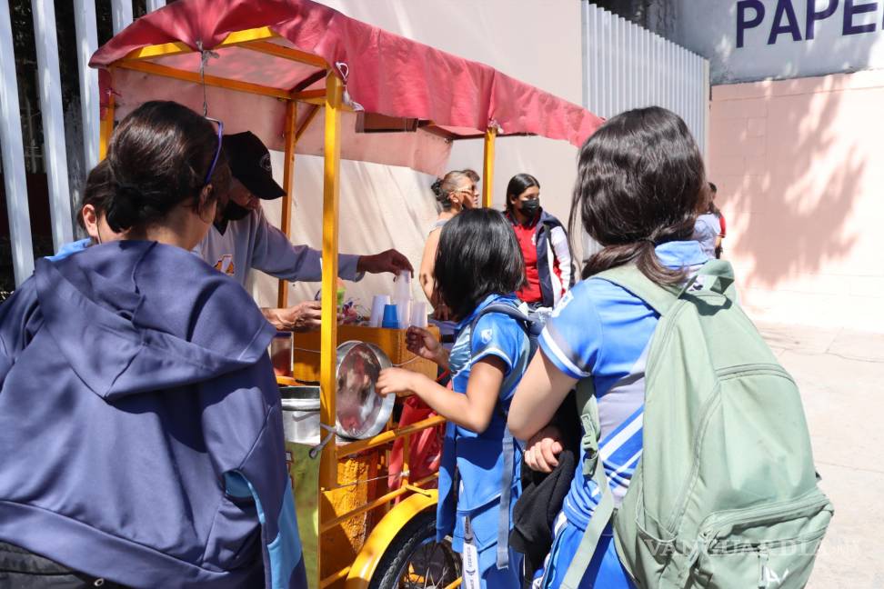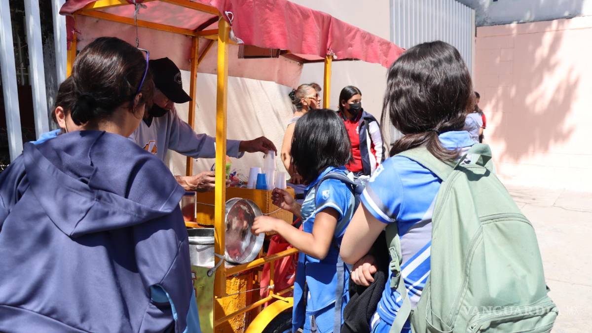 Desde churros, papas, nieve, nachos, gomitas y decenas de golosinas se ofertan al exterior de los planteles educativos en Saltillo, donde los niños, niñas y adolescentes se abarrotan para comprar con precios de entre 5 y hasta 25 pesos dichos alimentos.