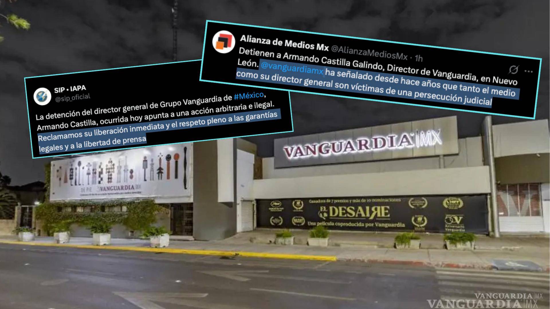 La SIP, asociación dedicada a defender las libertades de expresión y de prensa que cuenta con más de mil socios en toda América, señaló: “La detención del director general de Grupo Vanguardia de #México, Armando Castilla, ocurrida hoy, apunta a una acción arbitraria e ilegal. Reclamamos su liberación inmediata y el respeto pleno a las garantías legales y a la libertad de prensa”. Este mensaje se une a las múltiples alertas en favor de periodistas que la organización denuncia a través de sus canales.