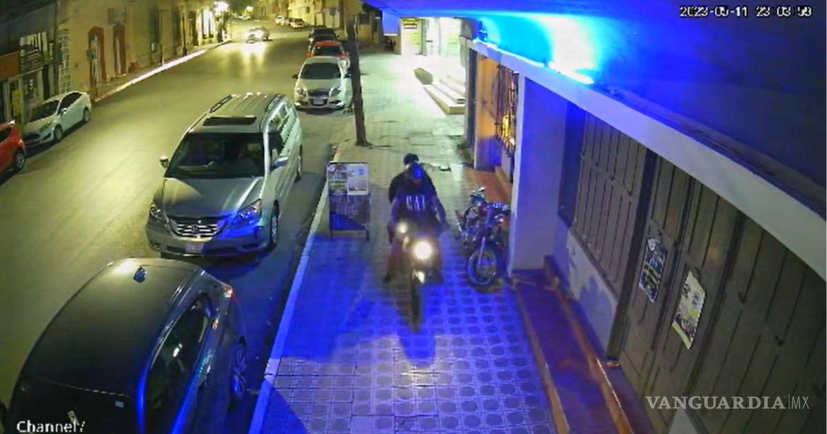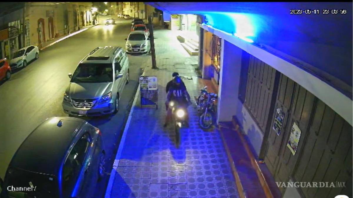La moto estaba aún costado de la puerta de acceso al negocio ubicado en Hidalgo entre Pérez Treviño y Aldama, donde se aprecian a dos sujetos, uno de ellos traía un casco negro; estatura aproximada de 1.70 metros de altura, vestía pantalón y playera negra con tenis blancos.