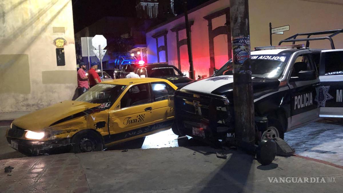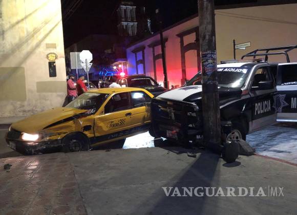 En el centro de Saltillo se produjo un accidente entre un vehículo de alquiler y una patrulla de la Policía Municipal, la cual quedó destrozada al colisionar contra un poste.