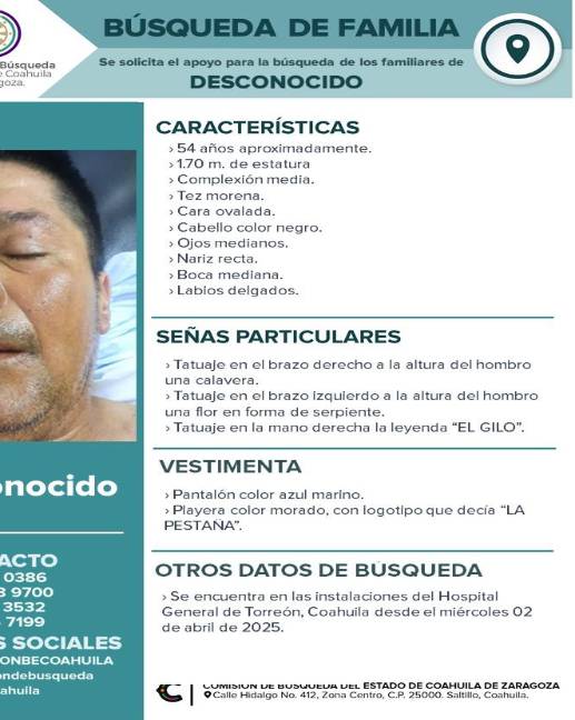 TORREÓN, COAH.- La Comisión de Búsqueda de Coahuila solicita la colaboración de la ciudadanía para localizar a los familiares de un hombre que se encuentra en calidad de desconocido en el Hospital General de Torreón. El hombre fue ingresado el 2 de abril de 2025 y hasta el momento no se ha logrado identificar su identidad.