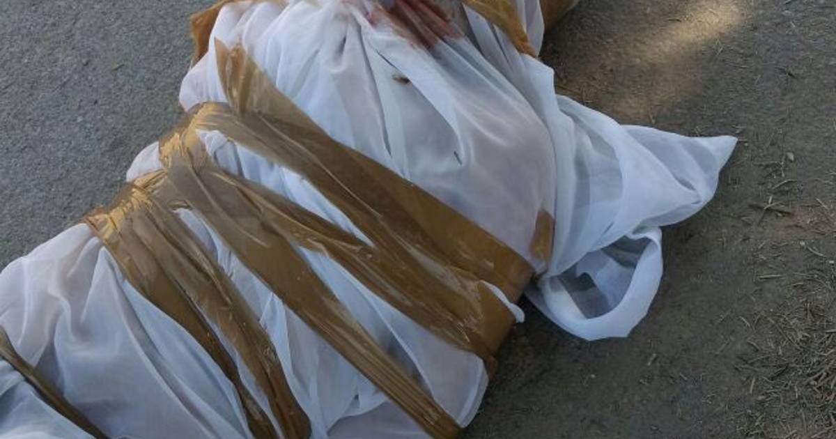 Estaba envuelto en una sábana blanca atada con cinta industrial color canela y al dejarlo al descubierto se percataron que tiene un torniquete con alambre en el cuello, el rostro encintado, atado de pies y manos, éstas últimas hacia atrás.