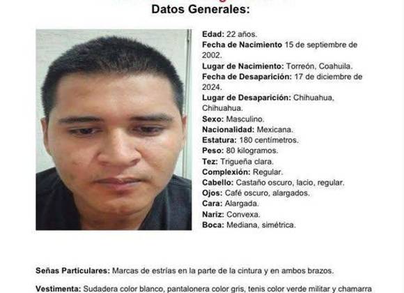 La Fiscalía del Estado de Coahuila ha informado que el joven desapareció cuando salió de su casa con destino a la ciudad chihuahuense, a bordo de un vehículo Volkswagen Gol, presuntamente trabajando como conductor de plataforma.