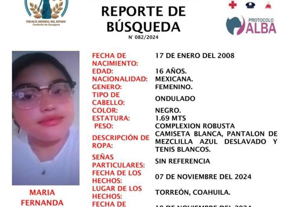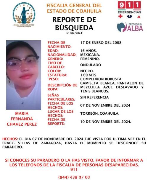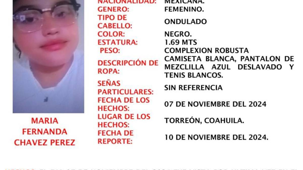 TORREÓN, COAH.- La Fiscalía de Personas Desaparecidas del Estado de Coahuila ha emitido una alerta en busca de la localización de María Fernanda Chávez Pérez, una menor de 16 años que fue vista por última vez el pasado 7 de noviembre en el Fraccionamiento Villas de Zaragoza, ubicado en el municipio de Torreón.