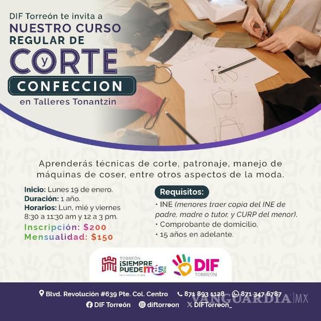 TORREÓN, COAH.- Con el objetivo de fomentar el desarrollo de habilidades productivas y el bienestar de las familias laguneras, el Sistema para el Desarrollo Integral de la Familia (DIF) Torreón anunció la apertura de inscripciones para su curso regular de corte y confección.