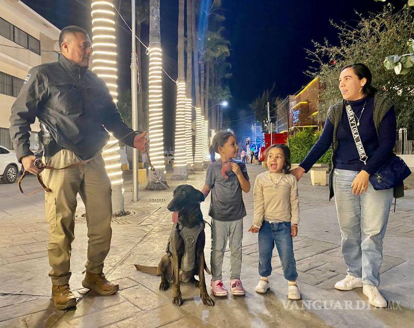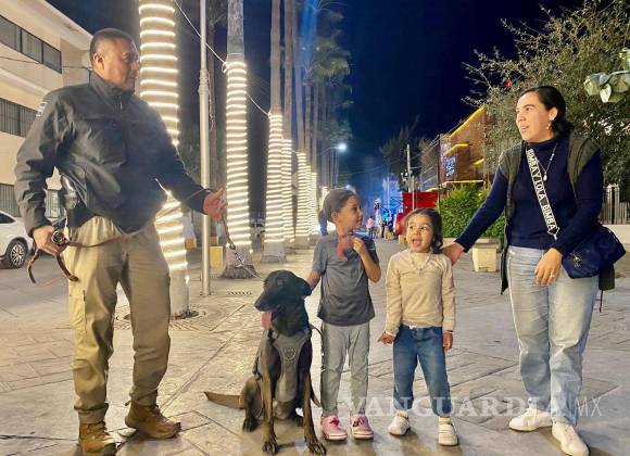 El Grupo K-9 recorrió la zona de bares del centro de Torreón, desde la Alameda Zaragoza hasta la Plaza Mayor, explicando a los asistentes la labor del agrupamiento en la detección de estupefacientes, armas y explosivos, además de fortalecer la cercanía con la comunidad.