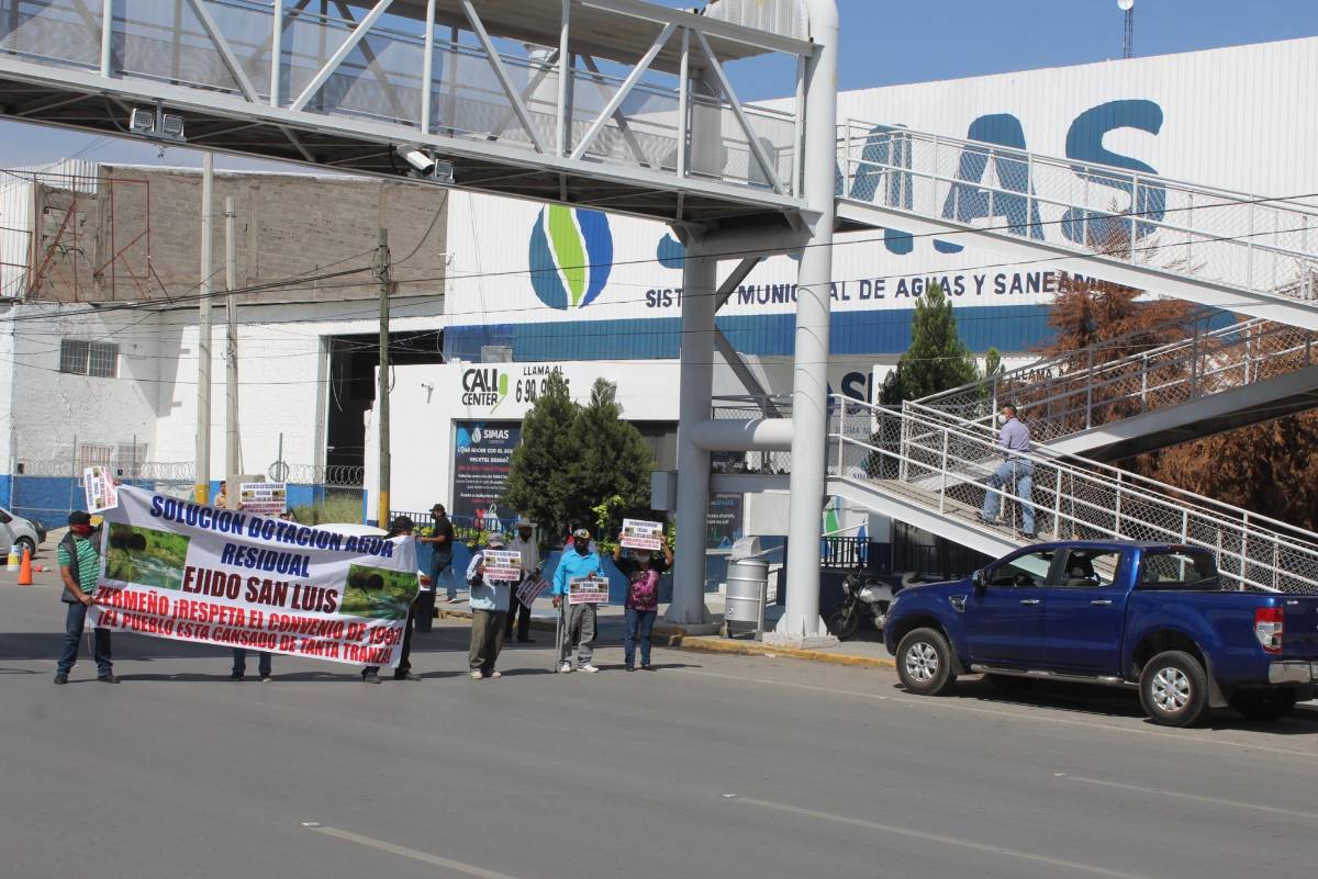 TORREÓN, COAH.- Habitantes del ejido San Luis de Torreón se manifestaron en las oficinas del Simas Torreón y amenazaron con destruir tubería que pasa por sus terrenos en caso que no les respeten la entrega de aguas residuales como, según dijeron, está acordado por un convenio que data de 1991.