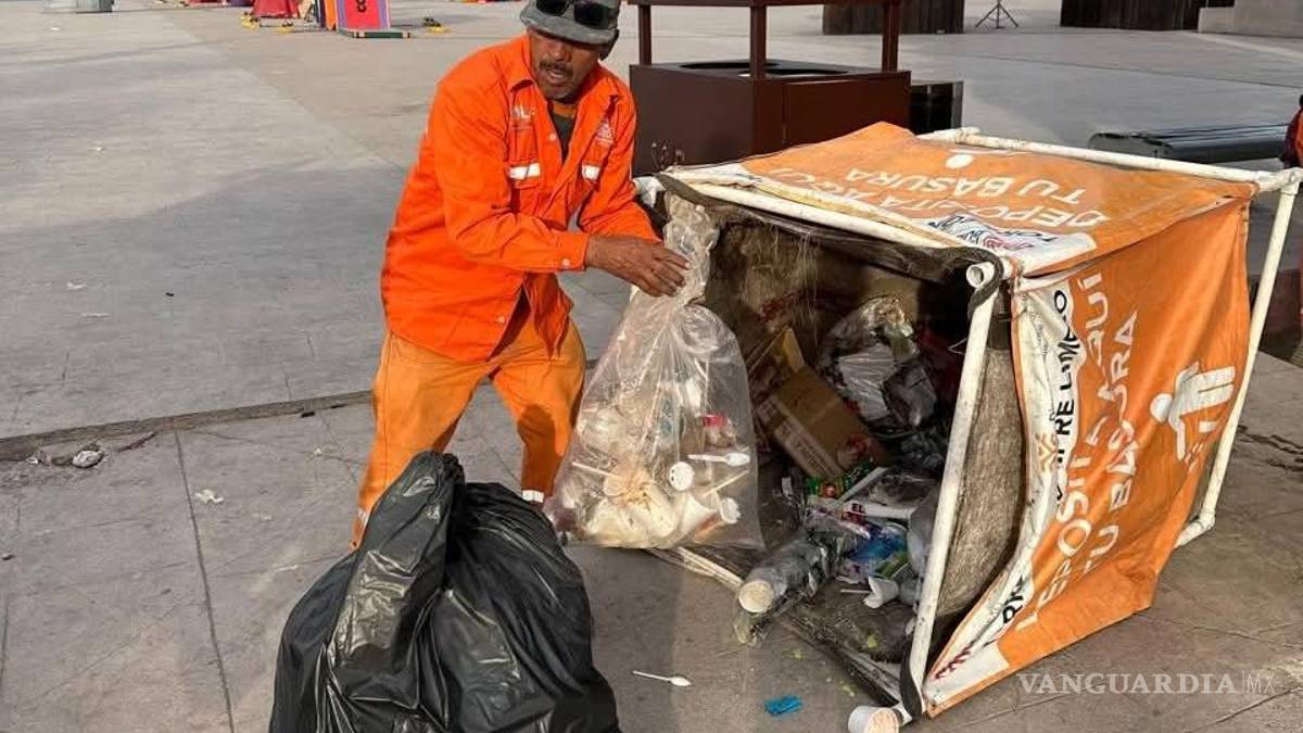 TORREÓN, COAH.- El personal de La Ola realizó una jornada de limpieza en la que recolectó cuatro toneladas de basura en el primer cuadro de la ciudad, como parte de las actividades posteriores a la “Mega Rosca de Reyes” celebrada el pasado domingo en la Plaza Mayor, además del aumento en la movilidad en los espacios públicos de Torreón.