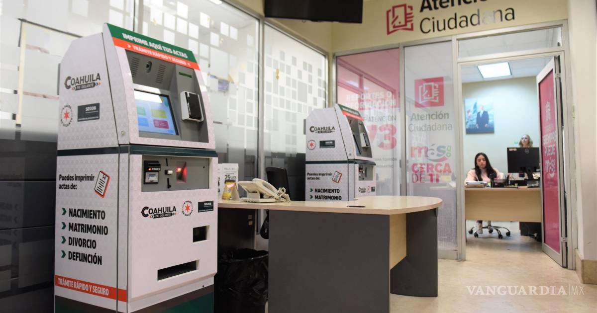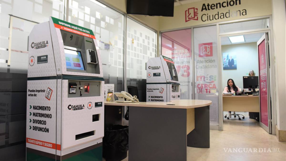 TORREÓN, COAH.- Con el objetivo de facilitar y agilizar la obtención de documentos oficiales, el Gobierno del Estado de Coahuila en coordinación con la administración municipal de Torreón puso en operación dos nuevos cajeros inteligentes para la expedición de actas del Registro Civil en la planta baja de la Presidencia Municipal.