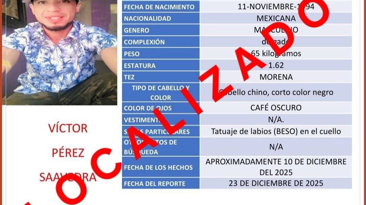 Víctor Pérez Saavedra, de 31 años de edad y conocido como “Chaparro”, fue localizado con vida y en buen estado de salud, informó la Fiscalía, luego de que se mantuviera activa su ficha de búsqueda desde mediados de diciembre.