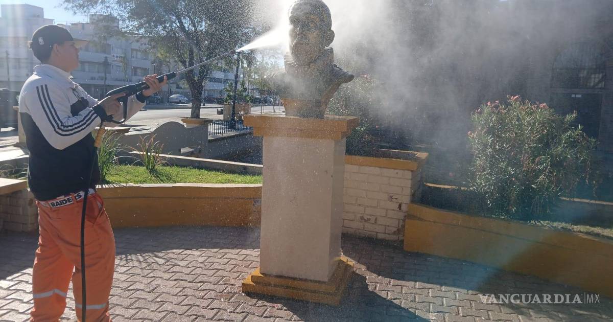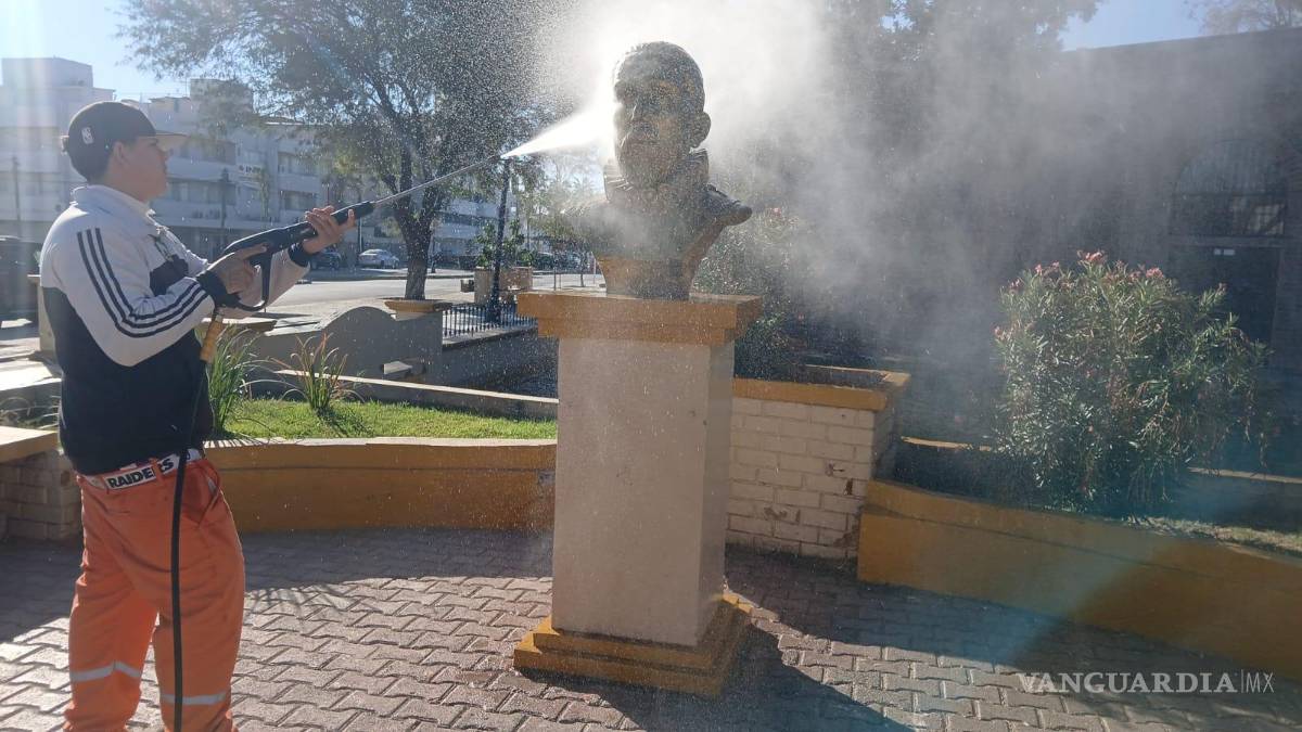 TORREÓN, COAH.- Como parte de las acciones para mejorar la imagen urbana, la Dirección de Servicios Públicos Municipales de Torreón intensificó los trabajos de limpieza y mantenimiento en monumentos históricos y espacios públicos emblemáticos de la ciudad, especialmente durante la temporada decembrina.