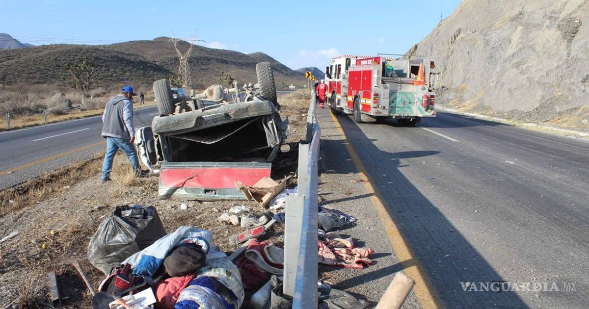 Trabajadores vuelcan y conductor queda prensado en carretera a Torreón; no hay heridos
