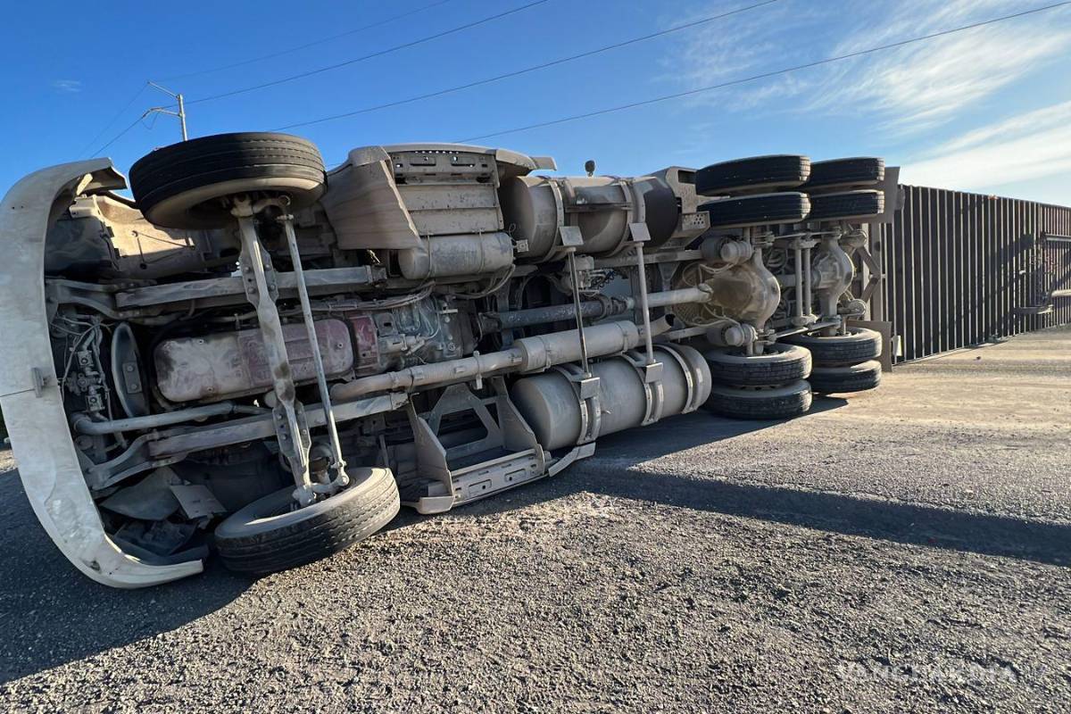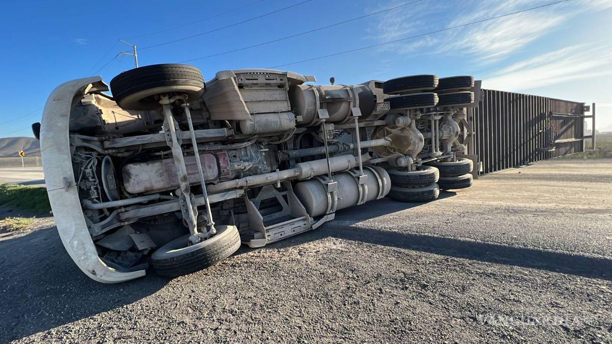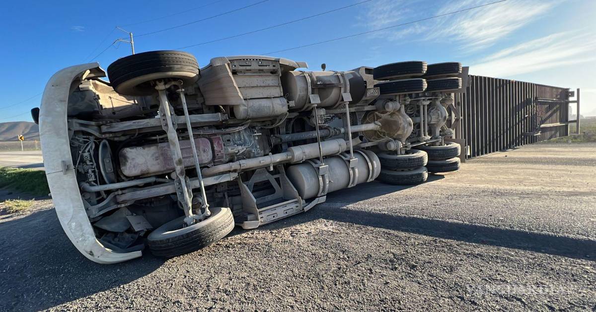 Tráiler pierde las llantas y peso de la caja lo hace volcarse en la carretera Saltillo-Monclova