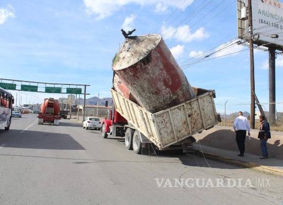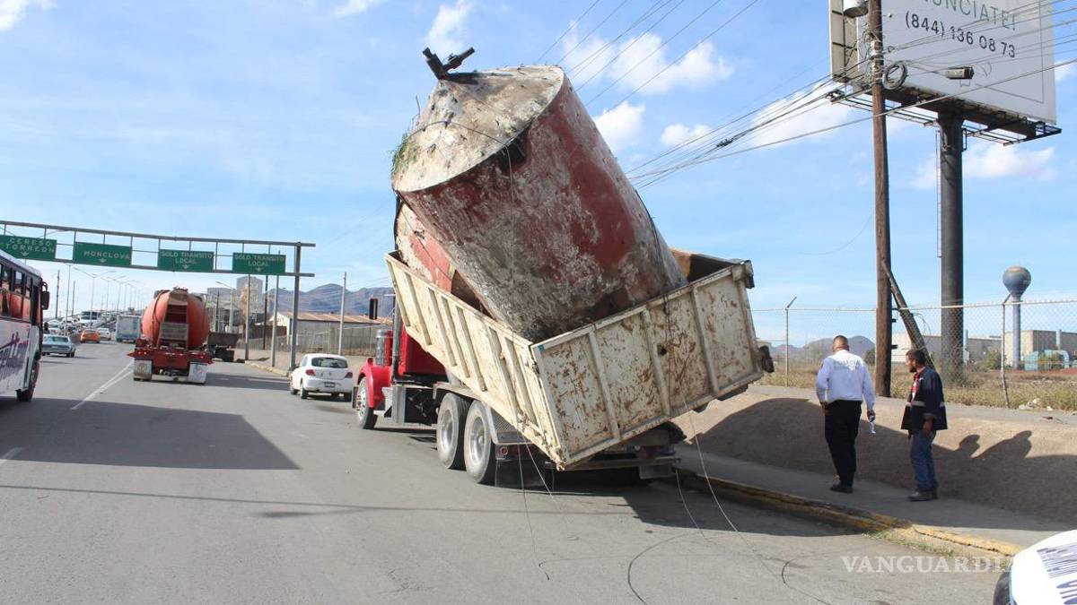Un tráiler que transportaba dos cisternas a una reconocida chatarrera, por por poco se vuelca en pleno periférico Luis Echeverría Álvarez, a la altura del bulevar Isidro López Zertuche en Saltillo.