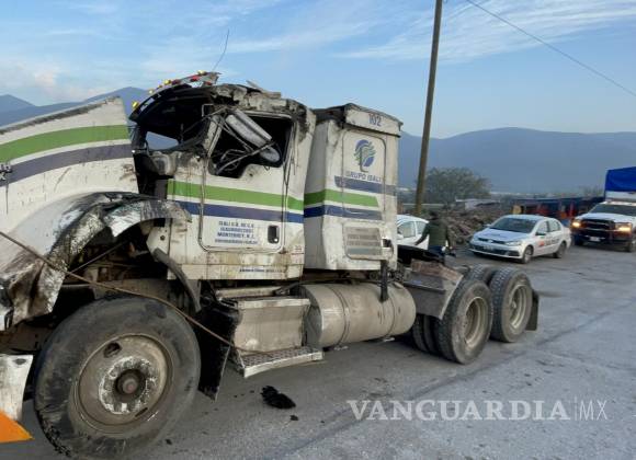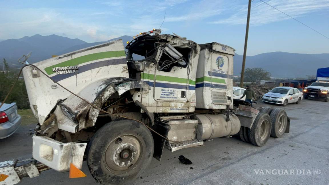 Trailero es vencido por el peso de la carga y vuelca en la autopista Monterrey-Saltillo