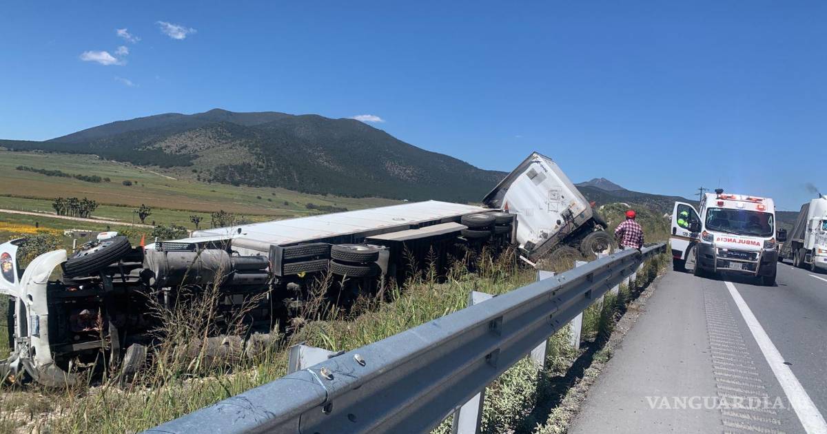 Saltillo.- Fuera de la carretera terminó un trailer y sus dos semirremolques que llevaba el operador con dirección a Matehuala, pues al parecer quedó dormido al volante, ocasionado el accidente, donde ocasionó caos vial.