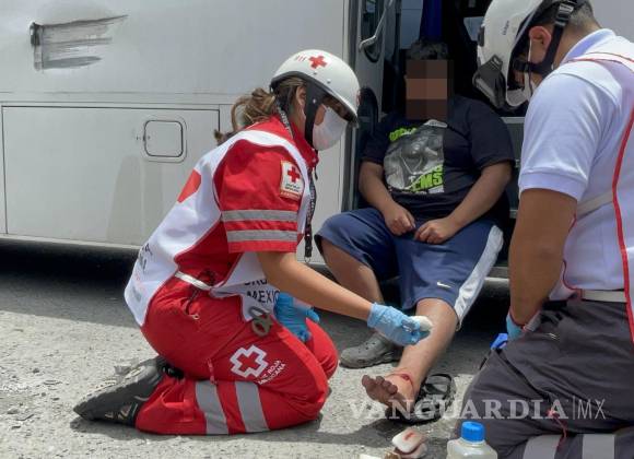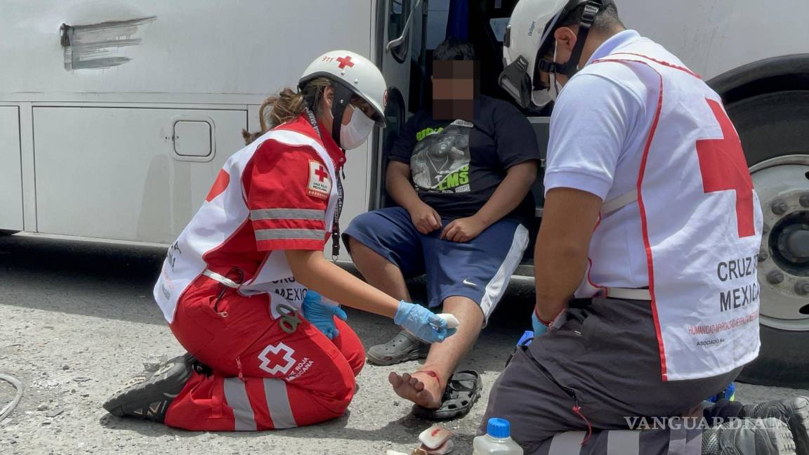 Transporte de personal se atraviesa y derriba a madre e hijo de motocicleta en Saltillo; menor resulta herido