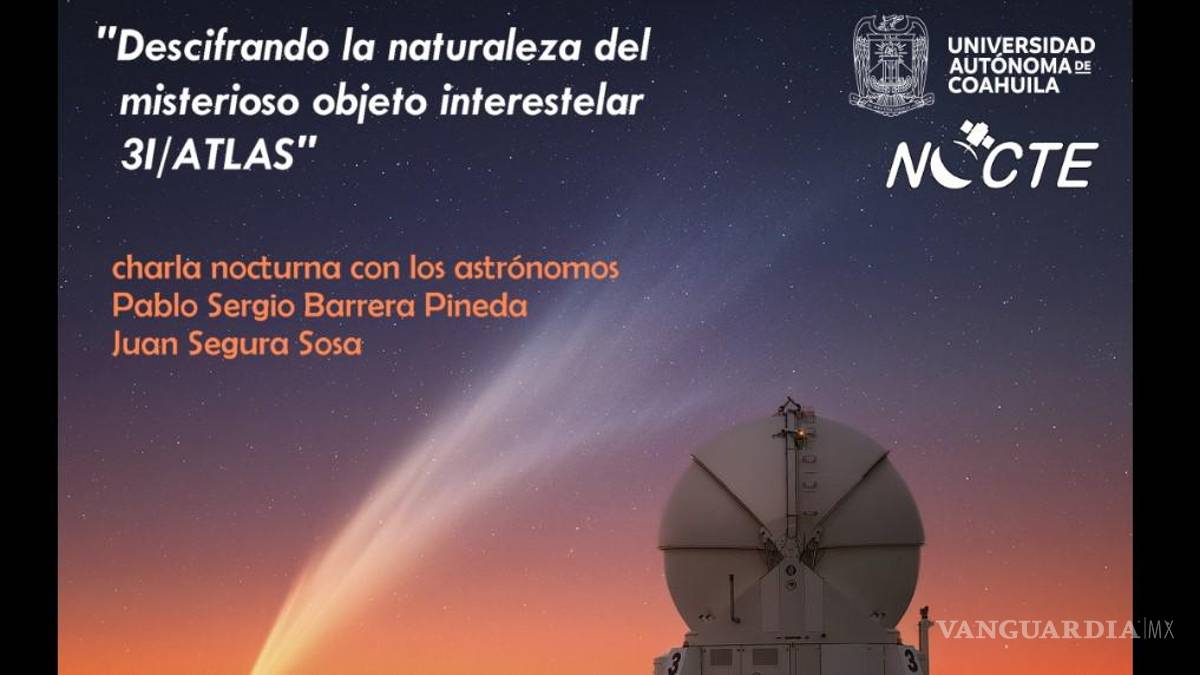 La Universidad Autónoma de Coahuila (UAdeC), a través del Observatorio Astronómico de la Facultad de Ciencias Físico Matemáticas en la Unidad Camporredondo, ofrecerá este miércoles 29 de octubre la charla “Descifrando la naturaleza del misterioso objeto interestelar 3I/Atlas”, impartida por los astrónomos Pablo Sergio Barrera Pineda y Juan Segura Sosa.