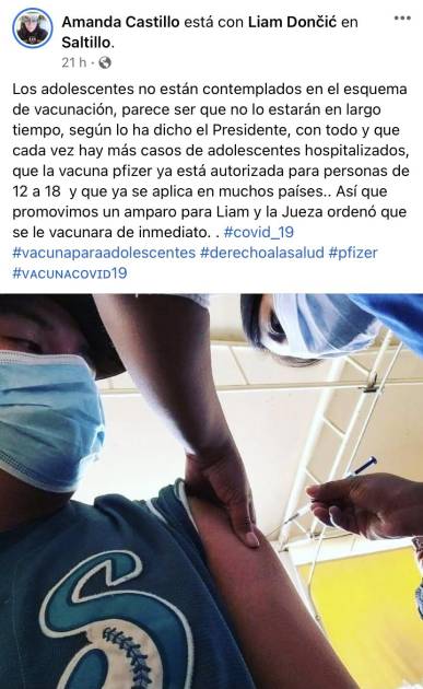 “Los adolescentes no están contemplados en el esquema de vacunación, parece ser que no lo estarán en largo tiempo, según lo ha dicho el Presidente, con todo y que cada vez hay más casos de adolescentes hospitalizados, que la vacuna Pfizer ya está autorizada para personas de 12 a 18 y que ya se aplica en muchos países.. Así que promovimos un amparo para Liam y la Jueza ordenó que se le vacunara de inmediato”, compartió en sus redes.
