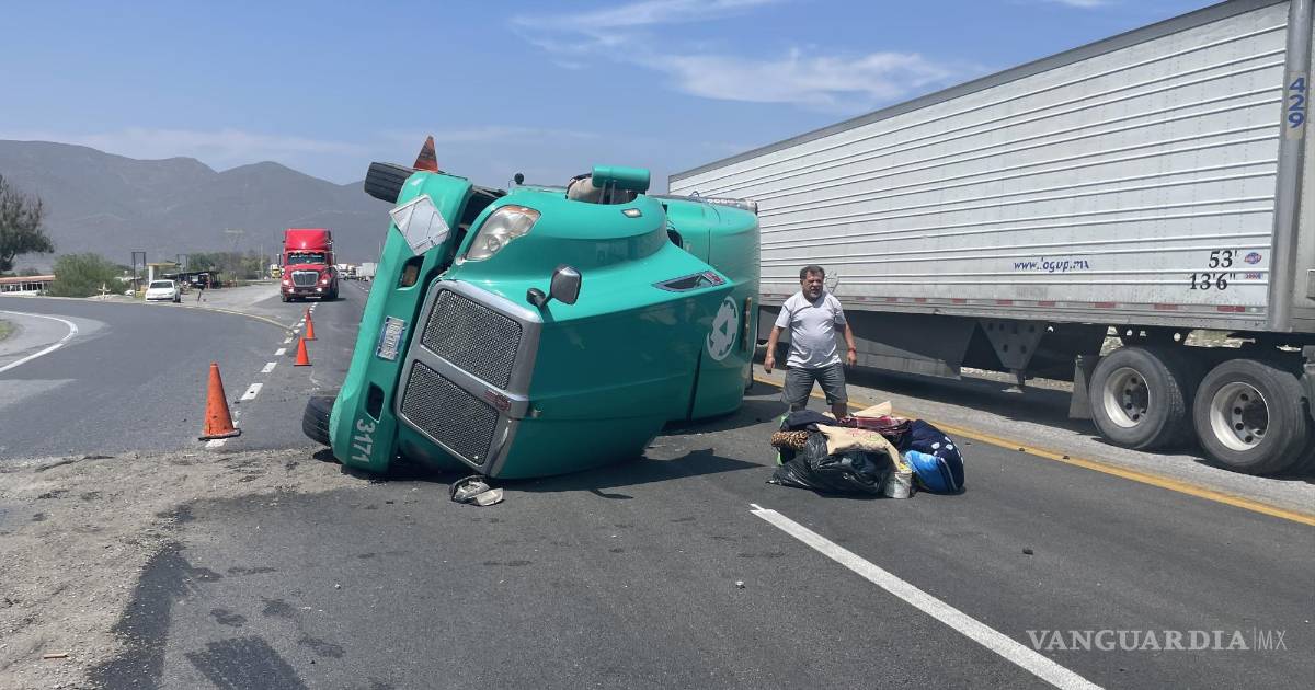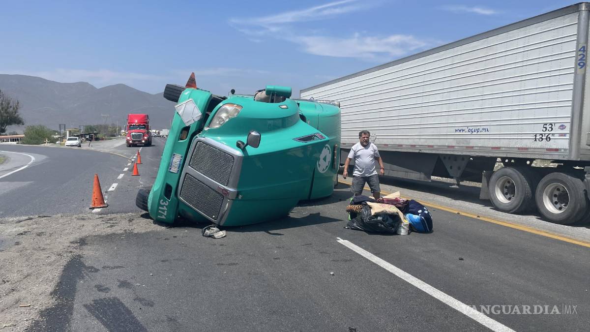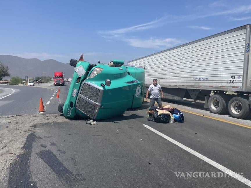 Veloz trailero vuelca en curva de la carretera Saltillo-Monterrey