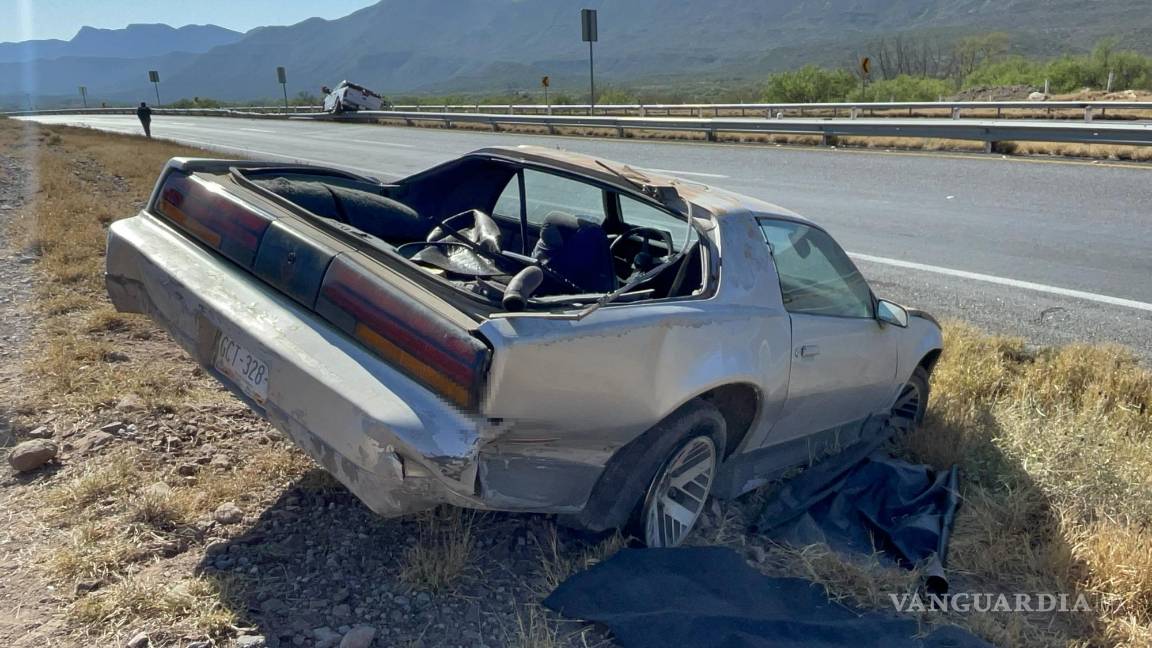 Un vehículo quedó encima de la barrera metálica de contención y el automóvil Pontiac Trans Sam que remolcaba volcó fuera de la carretera Saltillo-Torreón, a la altura del kilómetro 30+500, la mañana de este miércoles.