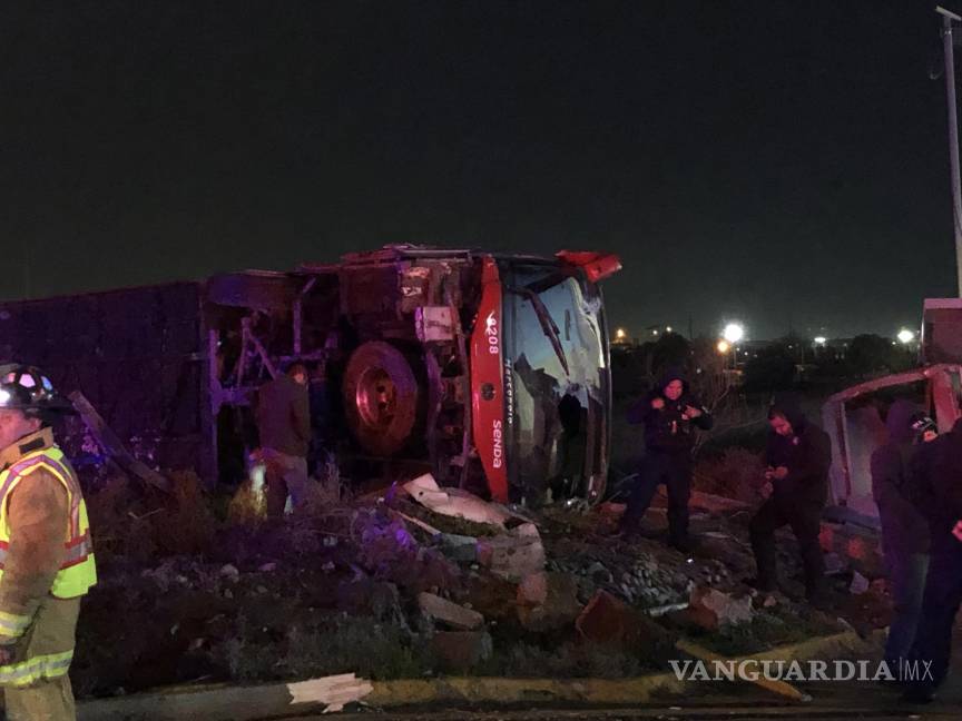Vuelca un autobús de pasajeros y deja una persona muerta y 12 heridas, en Ramos Arizpe