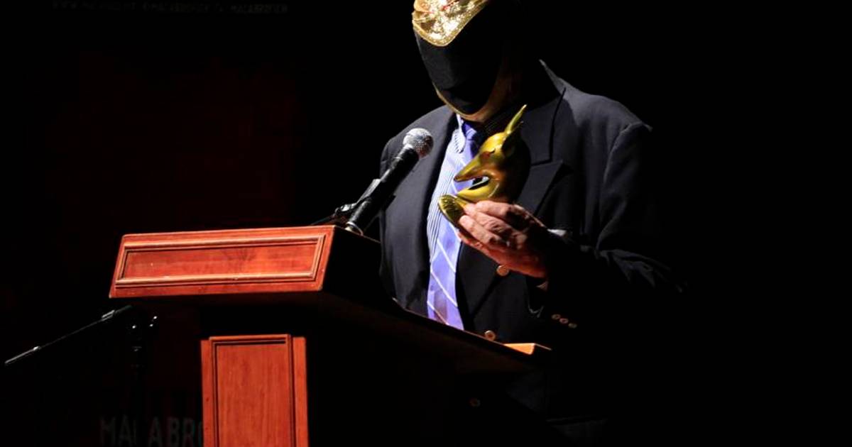 Edna Campos Directora de plataforma, fue la encargada de darle la estatuilla Macabro, al actor y luchador, quien se encuentra celebrando 43 años de carrera, ya que fue un 20 de agosto de 1971 cuando debuto en el mundo del pancracio en la Arena México.