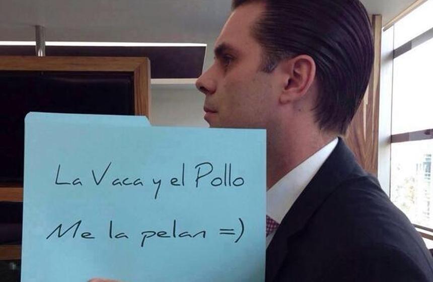 México, DF. El comentarista deportivo de Tv Azteca, Christian Martinoli, podría estar retando a los narradores de Televisa, 'Vaca' y 'Pollo', ya que circula en redes sociales una supuesta foto donde se puede leer el mensaje: "La Vaca y el Pollo me la pelan =)".