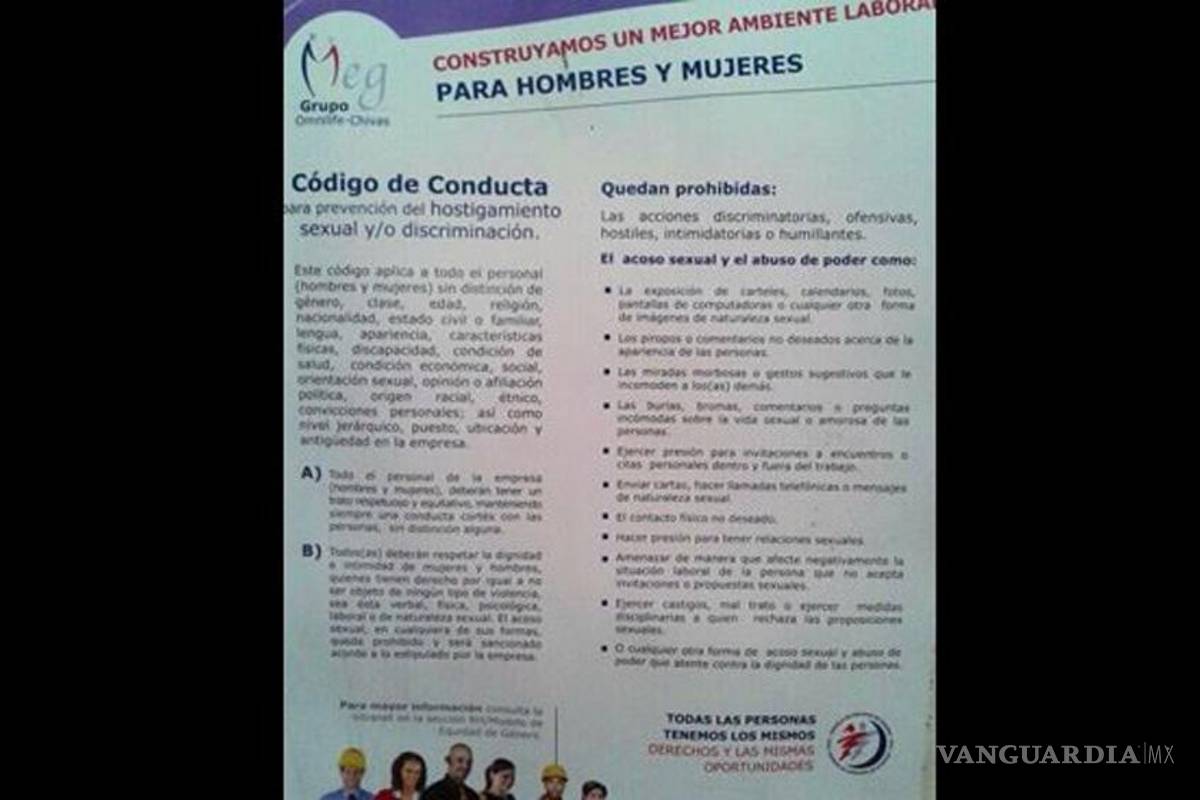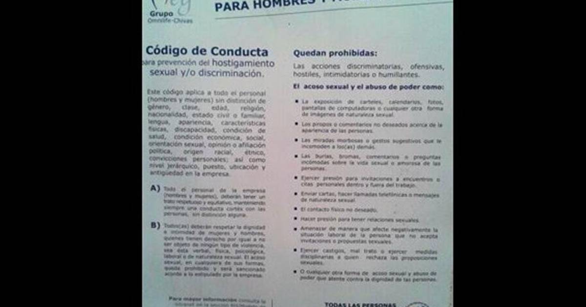 Se trata de un código de conducta, y dentro de los puntos que se incluyen ahí se indica que todo el personal, ya sea hombre o mujer, sin distinción de género, religión, clase, edad, orientación sexual, etc, debe tener un trato respetuoso y equitativo, además de mantener una conducta cortés.