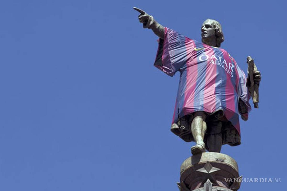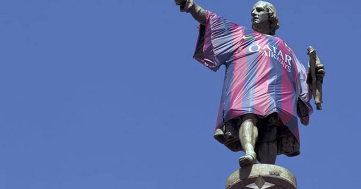 En una estrategia de Nike, el monumento del histórico navegante en la ciudad de Barcelona amaneció con la indumentaria del club para la temporada 2013/2014