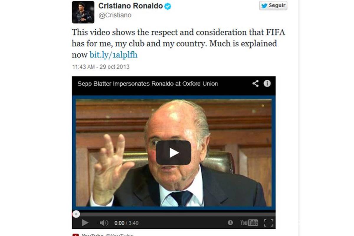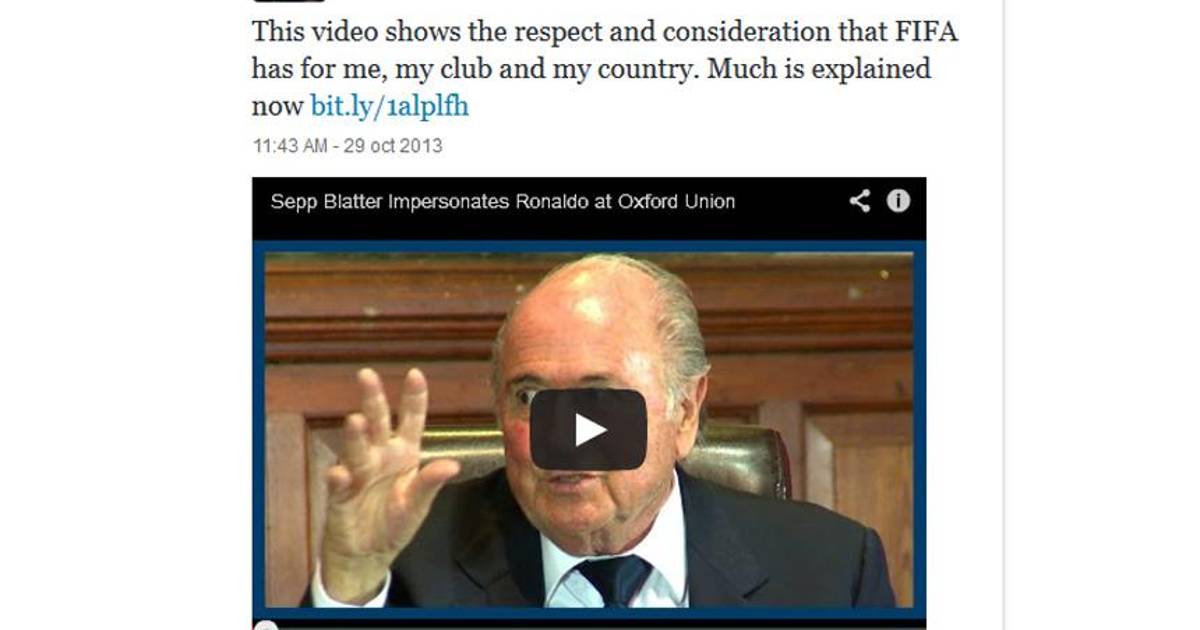 "Este video muestra claramente el respeto y la consideración que la FIFA tiene para mí, para mi club y mi país. Mucho se explica ahora. Deseo que el señor Blatter tenga salud y una larga vida, con la certeza de que continuará siendo testigo, como se merece, de los éxitos de sus equipos y jugadores favoritos", posteó Cristiano Ronaldo en su cuenta de Facebook.