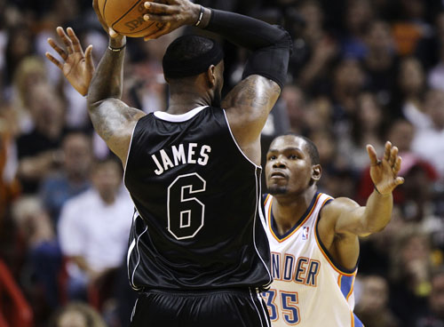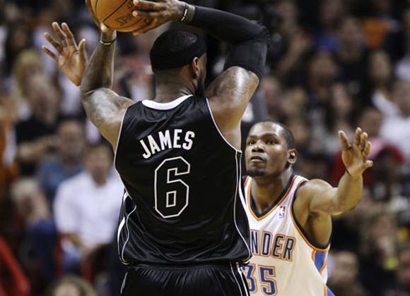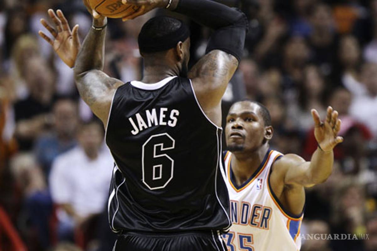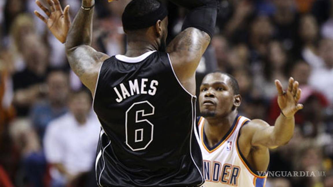 El astro de Miami había convertido 41 tantos en la victoria sobre Philadelphia. Y aportó otros 34 para sostener el 98-93 contra Oklahoma City Thunder, el equipo de su máximo rival en la carrera por el premio MVP, Kevin Durant