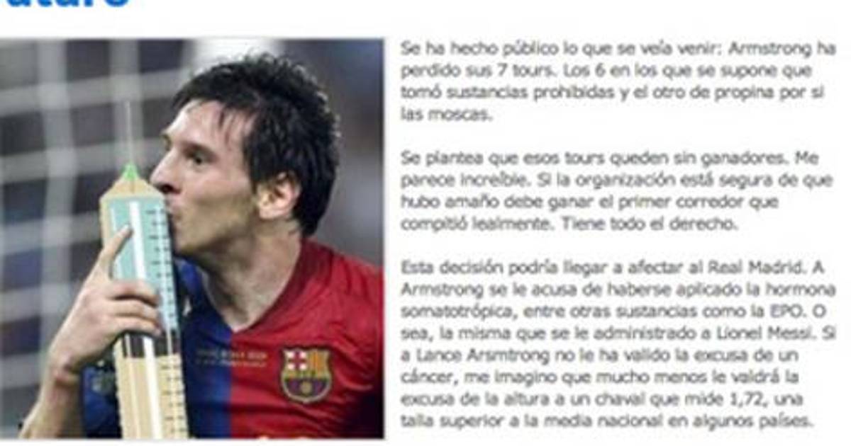 En el texto se planteaba que la decisión de retirarle los siete títulos del Tour de France a Lance Armstrong podría llegar a afectar a Real Madrid. "Al ciclista se le acusa de haberse aplicado la hormona somatotrópica, entre otras sustancias como la EPO. O sea, la misma que se la ha administrado a Messi", señalaba.