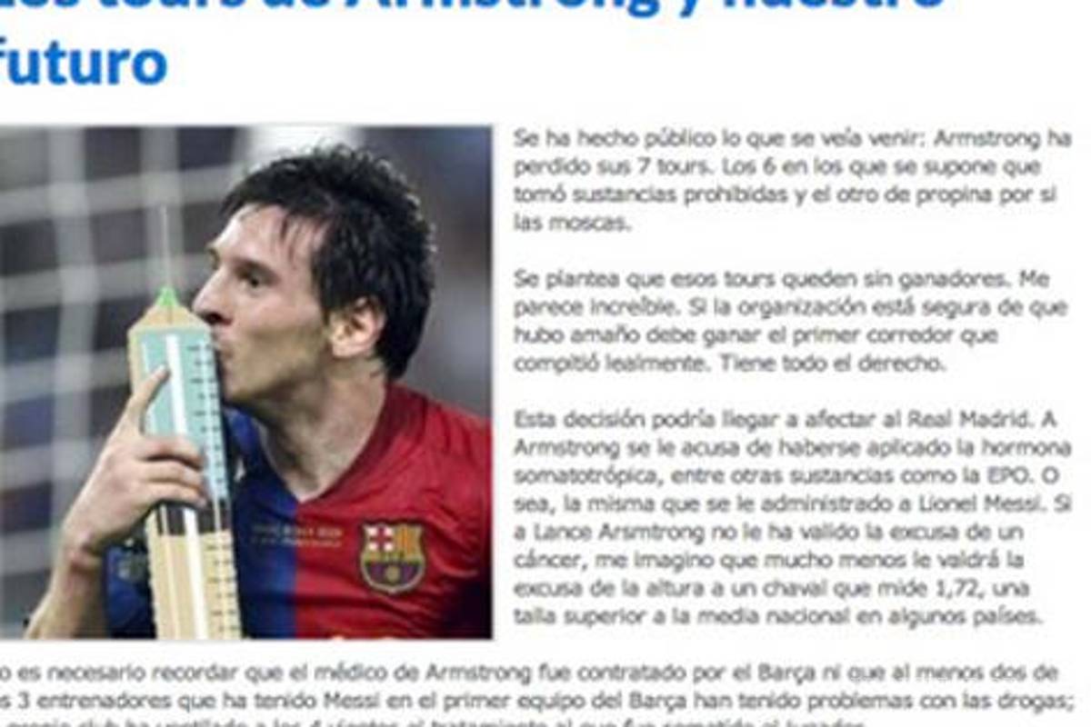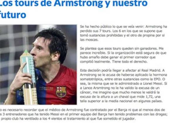 A raíz de la sanción a Armstrong, un sitio madrileño atribuyó a Barcelona darle a "Lio" la misma sustancia prohibida por la que fue sancionado el ciclista. El blog pidió disculpas.