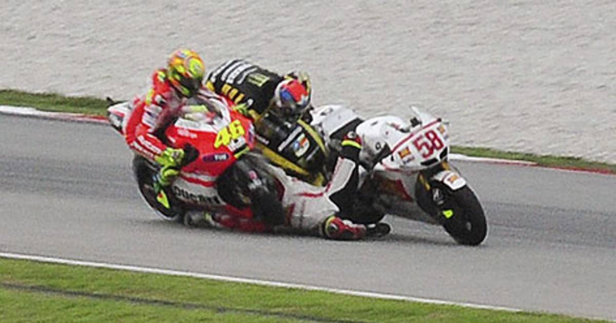 Marco Simoncelli perdió el control de su moto, y lo arrastró hacia la pista donde chocó con un par de pilotos, el casco salió, y el italiano quedó inmóvil