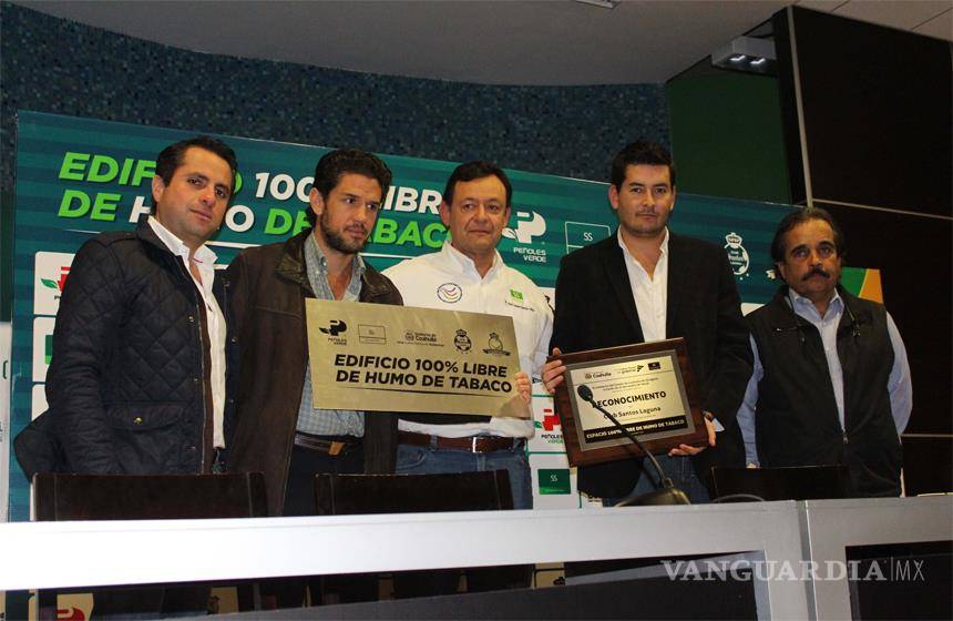Torreón, Coah.- El Club de Futbol Santos Laguna se unió el Programa Edificios 100 por ciento Libres de Humo de Tabaco que impulsa el Gobierno del Estado a través de la Secretaría de Salud.
