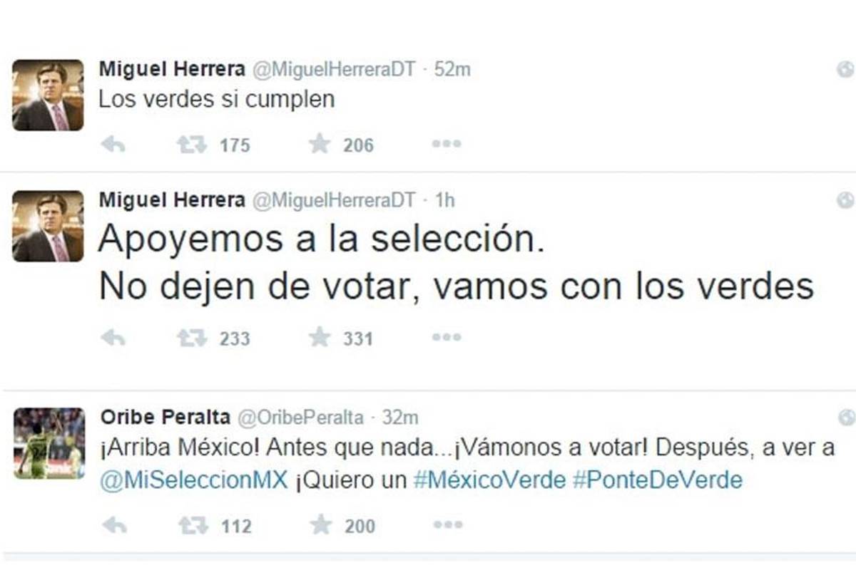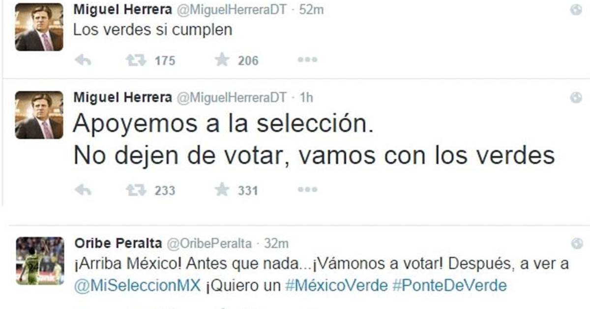 México, DF. En pleno día de elecciones en México, el técnico de la Selección Nacional, Miguel Herrera, publicó su apoyo a un partido político, toda vez que el Instituto Nacional Electoral (INE), estableció una veda electoral que impide hacer cualquier tipo de proselitismo desde el jueves pasado. Incluso, al ser figura pública, el "Piojo" estaría incurriendo en un delito electoral.