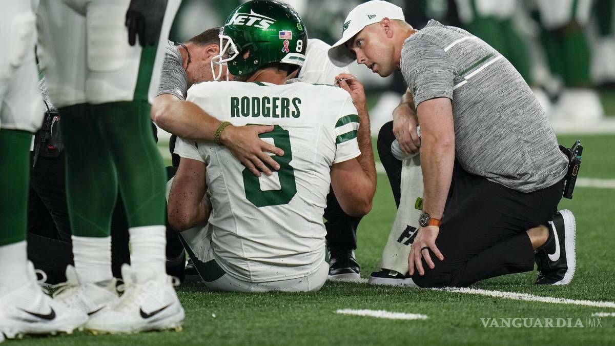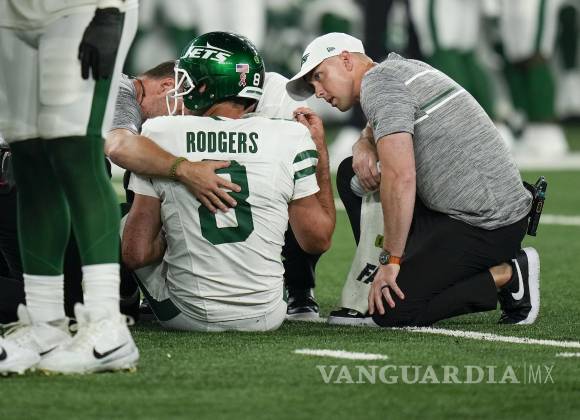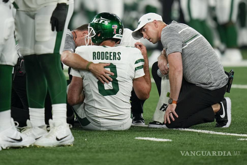 EAST RUTHERFORD.— Aaron Rodgers salió lesionado en la cuarta jugada ofensiva en su debut como miembro de los Jets de Nueva York y requirió ser asistido con una aparente lesión en el tobillo el lunes por la noche.