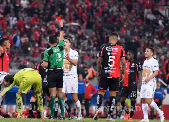 “El delantero de Pumas intenta un remate de chilena, pero no juega el balón y golpea en el rostro a su adversario, cometiendo juego brusco grave, poniendo en peligro la integridad física de su oponente. El árbitro sanciona la falta y muestra tarjeta roja. El VAR, mediante la revisión silenciosa, confirma su decisión. Es importante recordar que la intención no se contempla más en la regla de juego. Es una decisión arbitral correcta”.