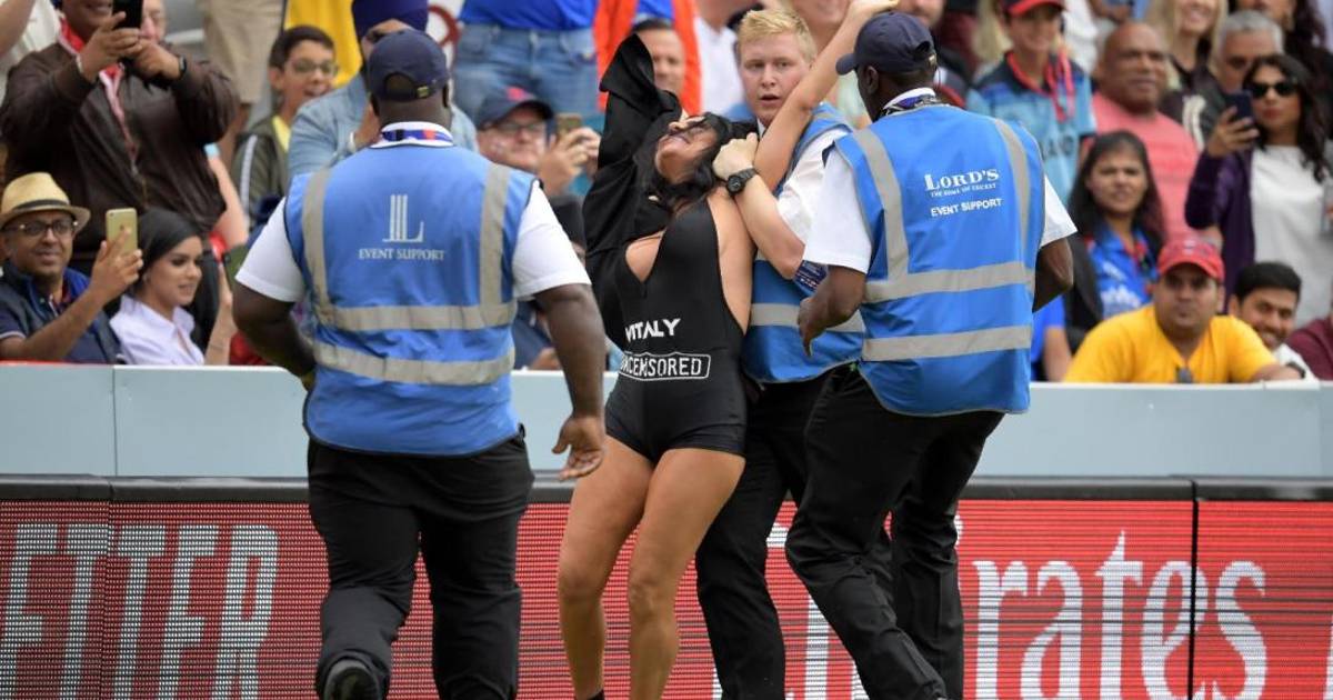 Elena Vulitsky captó la atención del Lord's Cricket Ground cuando pasó por encima de los carteles de publicidad y detuvo por unos minutos el duelo entre Inglaterra y Nueva Zelanda que define al campeón mundial de críquet.