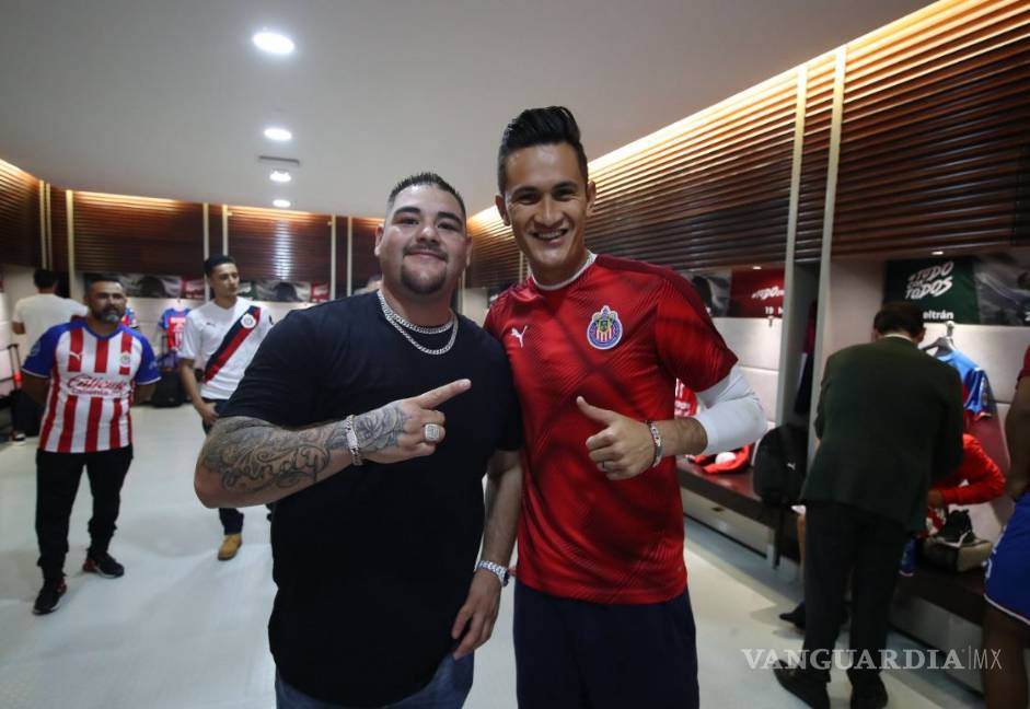 El campeón de los pesados visitó el Estadio Akron antes del encuentro ante Pachuca y bajó a los vestidores para convivir con los futbolistas del equipo.