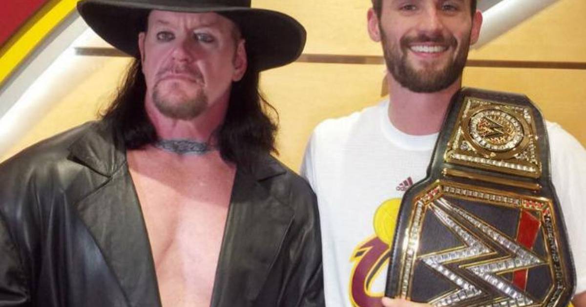 Here's Kevin Love getting a title belt from "The Undertaker." #Cavs pic.twitter.com/nO9q0M0mb1
