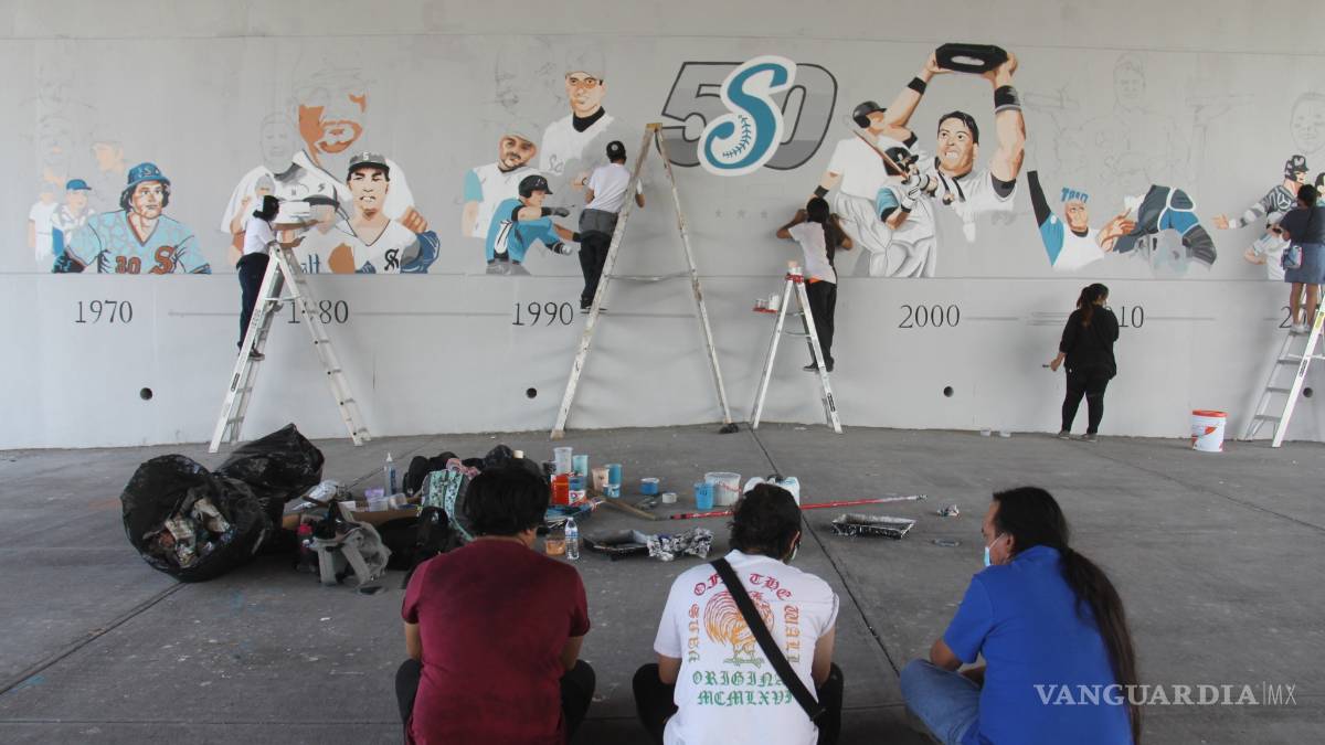 Varios alumnos de Artes Plásticas de la Universidad Autónoma de Coahuila realizan un mural en honor al 50 aniversario del club de beisbol Saraperos de Saltillo en coordinación con el municipio, en el marco del 443 Aniversario de la ciudad de Saltillo.