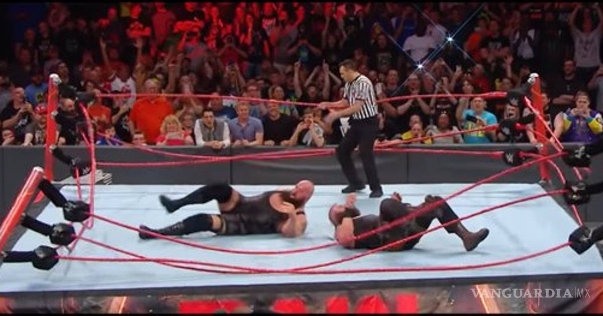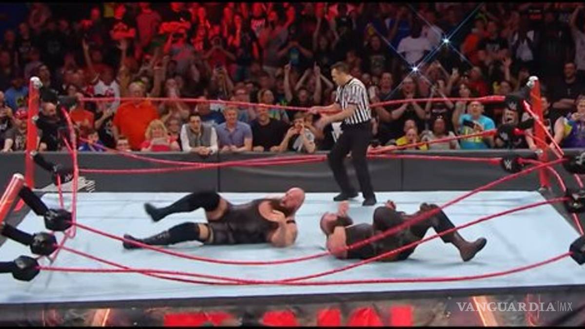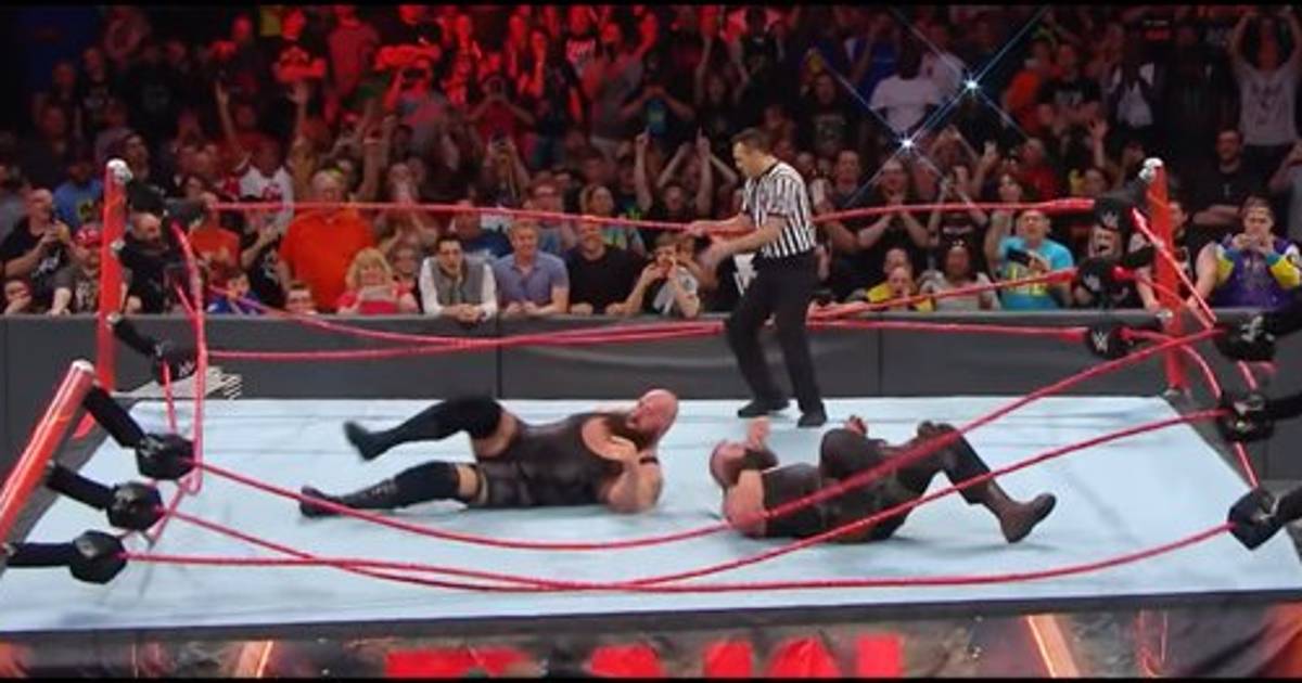 The impact of two colossal Superstars leads to one INSANE ring collapse in our main event! @BraunStrowman @WWETheBigShow #RAW pic.twitter.com/bb1WvDRXGZ