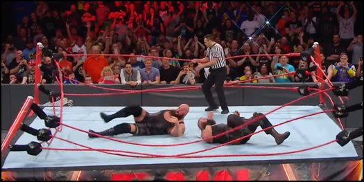 Durante la batalla, ellos intentaron finiquitar la lucha con un lance, pero fueron detenidos por su contrincante, pero el Big Show subió a las alturas y fue interceptado por Strowman.