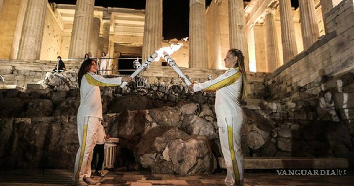 Tras un relevo en el estadio, la campeona griega de remo Katerina Nikolairou encendió el calderón dorado, rodeado por sacerdotisas, y la multitud estalló en vítores.